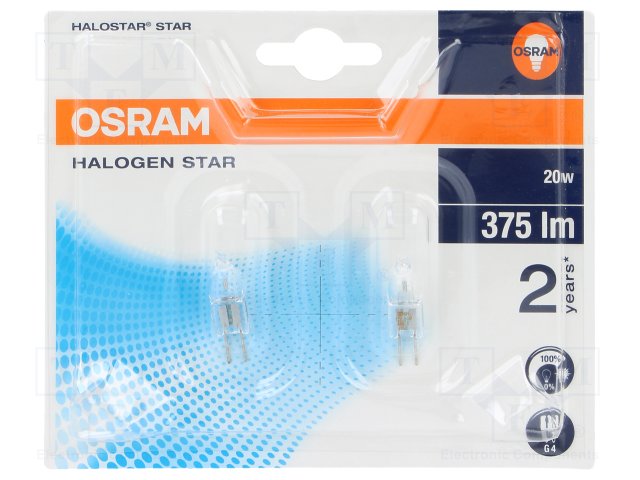Лампочка: галогенная; 12ВAC; 20Вт; G4; 320лм; Кол-во шт: 2 |