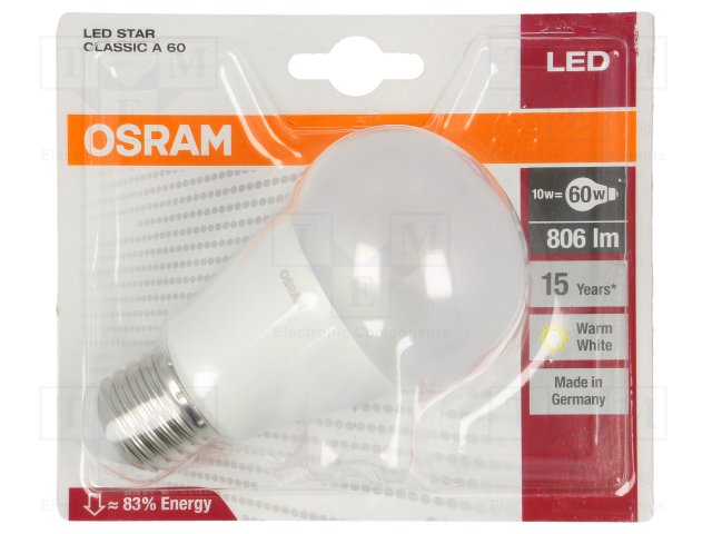 Лампочка LED; теплый белый; E27; 230ВAC; 806лм; 8Вт |