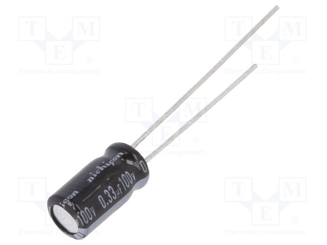 Конденсатор: электролитический; THT; 0,33мкФ; 100ВDC; Ø5x9мм; ±20% |
