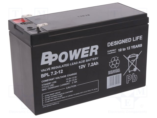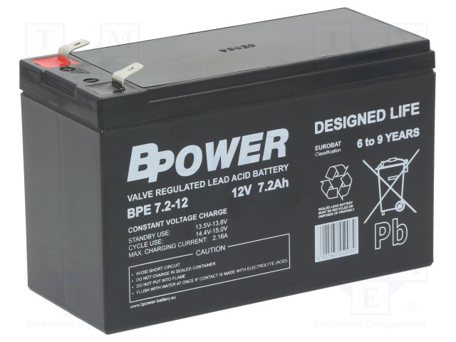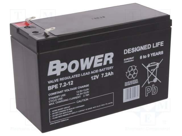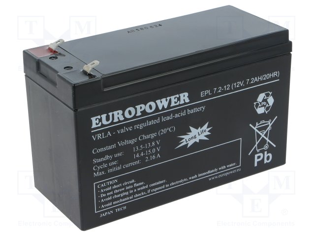 Аккум: свиноцово-кислотный; 12В; 7,2Ач; AGM; необслуживаемый |