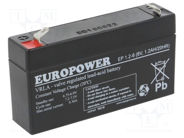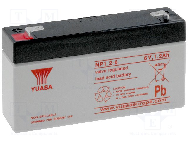 Аккум: свиноцово-кислотный; 6В; 1,2Ач; AGM; необслуживаемый |