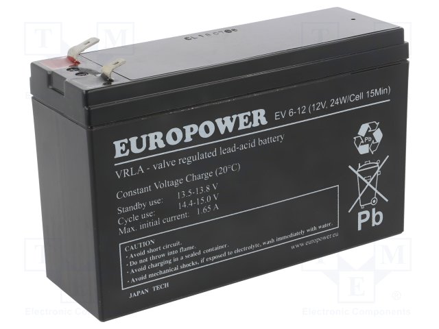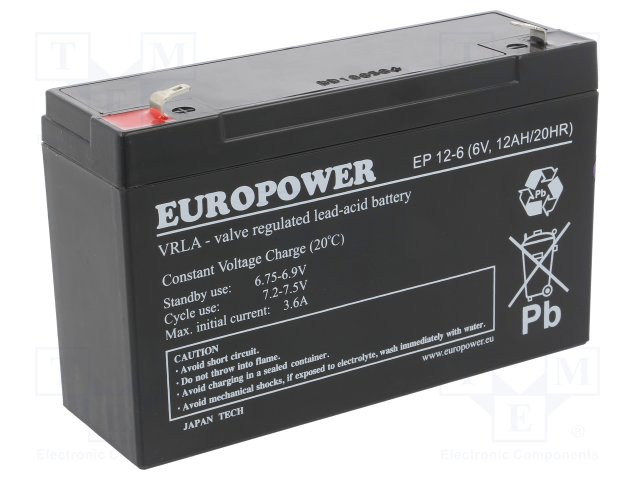 Аккум: свиноцово-кислотный; 6В; 12Ач; AGM; необслуживаемый |