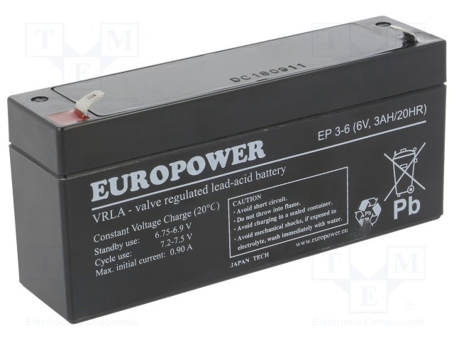 Аккум: свиноцово-кислотный; 6В; 3Ач; AGM; необслуживаемый |