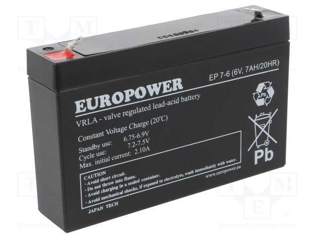 Аккум: свиноцово-кислотный; 6В; 7Ач; AGM; необслуживаемый |