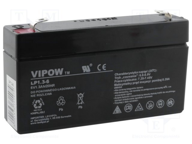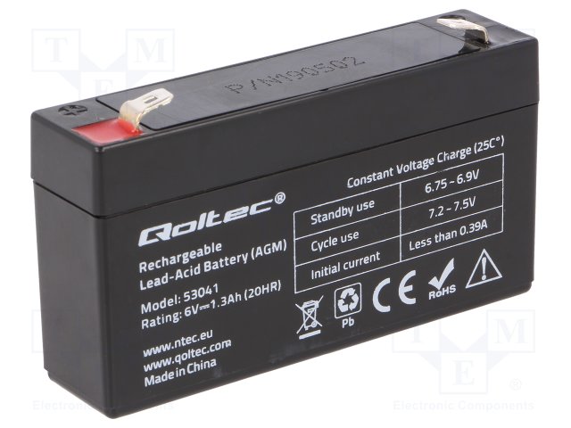 Аккум: свиноцово-кислотный; 6В; 1,3Ач; AGM; необслуживаемый |