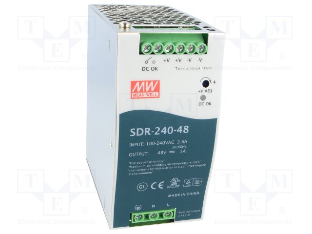 Блок питания: импульсный; 240Вт; 48ВDC; 5А; 85÷264ВAC; 90÷350ВDC |