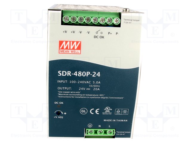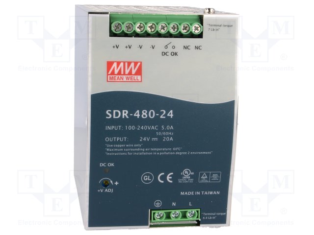 Блок питания: импульсный; 480Вт; 24ВDC; 24÷28ВDC; 20А; 85÷264ВAC |