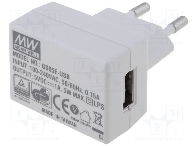 Блок питания: импульсный; 5ВDC; 1А; Вых: USB; 5Вт; Вилка: EU; 74,5%