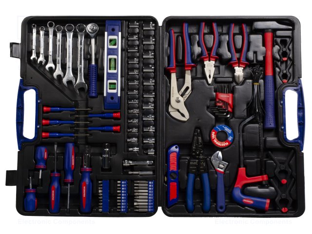 Вид набора бокорезы, ключи, молоток, пила по металлу, струбцины, уровень, шестигранные ключи, щипцы, щипцы длиной 135 мм для захвата