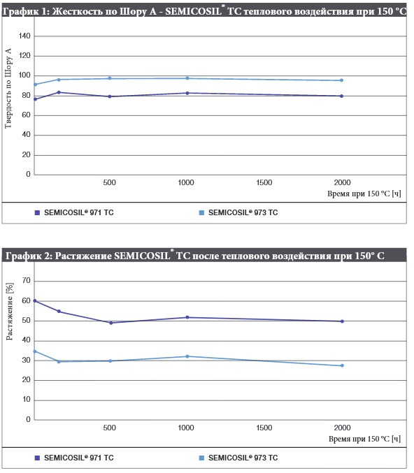 температуре 150 °С.Также теплопроводные клеи WACKER достигают отличных результатов в тестах на относительное удлинение при разрыве (диаграмма 2). Оно минимально изменяется в течение длительного времени. Материал не становятся хрупким. Что это значит для Вас, производитель? У вас есть уверенность, что теплопроводящая связь между устройством и охлаждающим элементом остается функциональной в течение длительного времени.