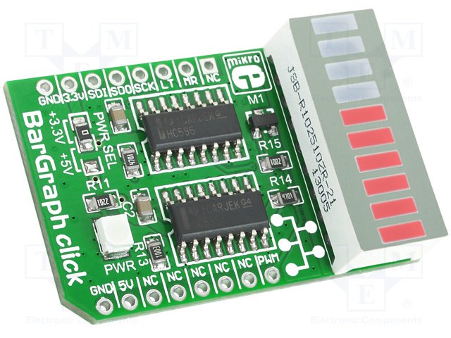 Click board; LCD-дисплей; SPI; 74HC595; mikroBUS вилка; 3,3/5ВDC