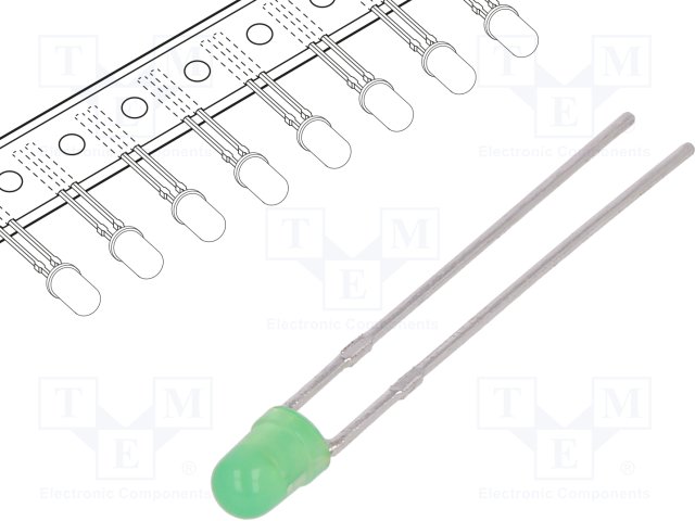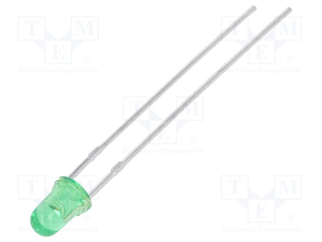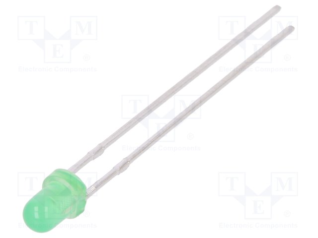 LED; 3мм; зеленый; 1÷3мкд; 50°; Поверхность: выпуклая; Кол-во выв: 2 |