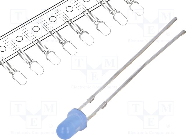 LED; 3мм; голубой; 500мкд; 40°; Поверхность: выпуклая; Шаг: 2,54мм |