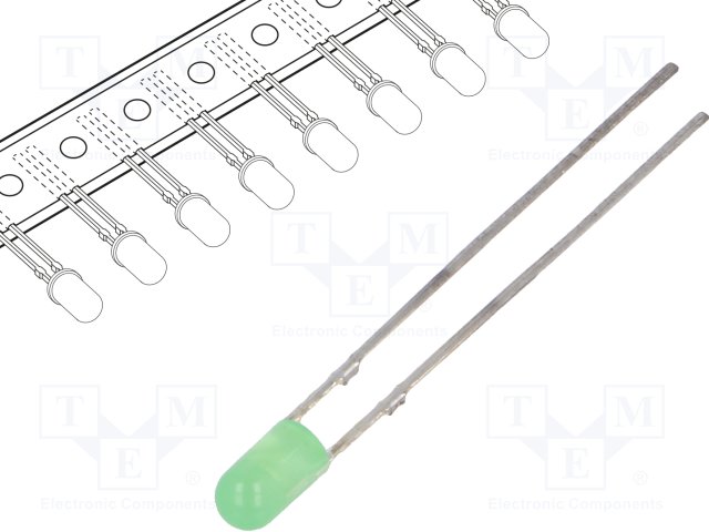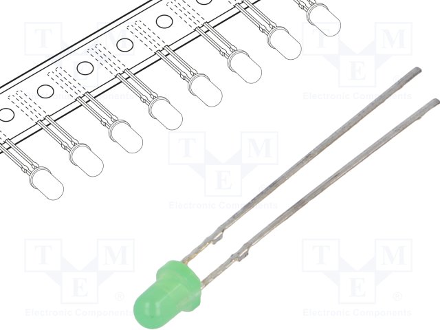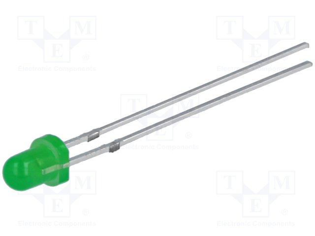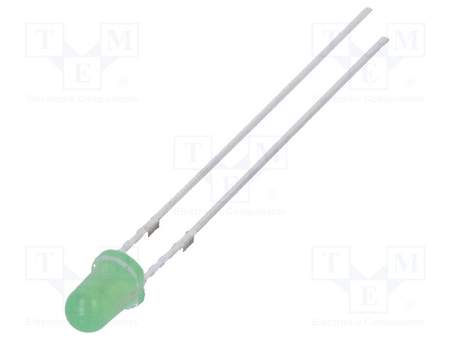 LED; 3мм; зеленый; 20мкд; 30°; Поверхность: выпуклая; Шаг: 2,54мм |