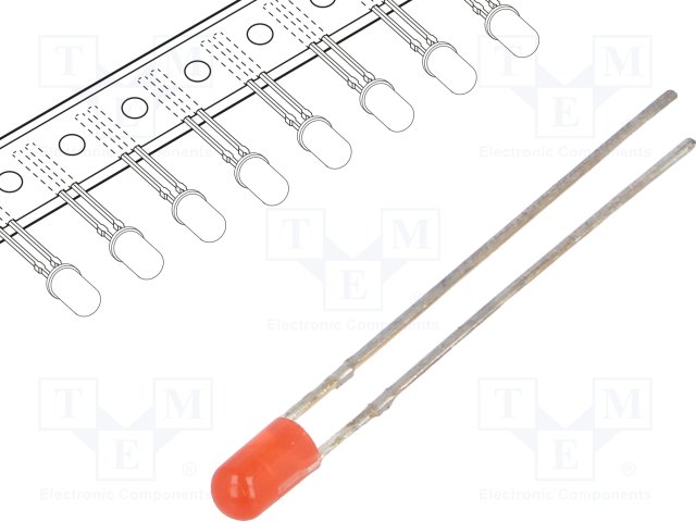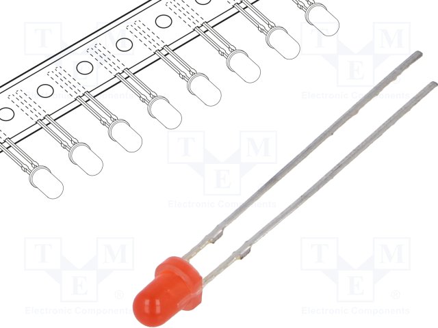 LED; 3мм; красный; 30мкд; 30°; Поверхность: выпуклая; Шаг: 2,54мм |