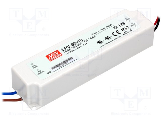 Блок питания: импульсный; LED; 60Вт; 15ВDC; 4А; 90÷264ВAC; IP67 |
