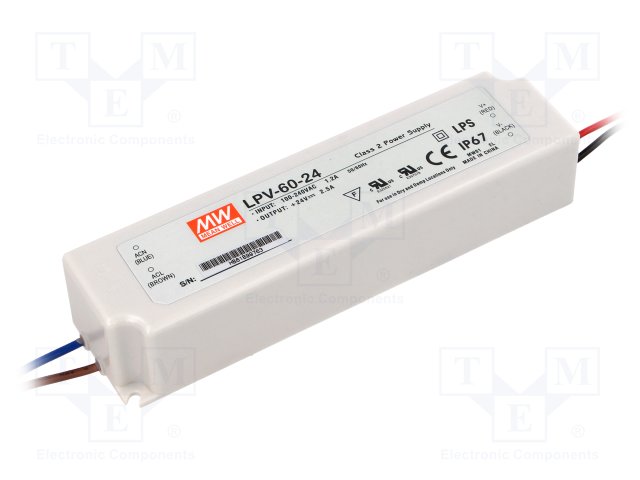 Блок питания: импульсный; LED; 60Вт; 24ВDC; 2,5А; 90÷264ВAC; IP67 |