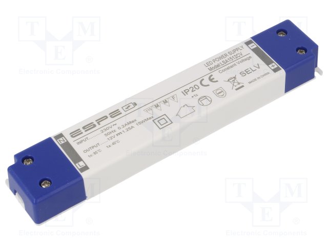 Блок питания: импульсный; LED; 15Вт; 12ВDC; 1,25А; 220÷240ВAC; IP20 |