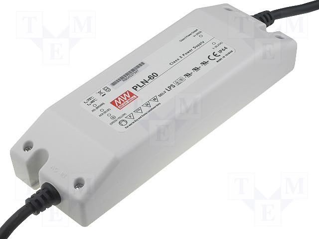 Блок питания: импульсный; LED; 60Вт; 20ВDC; 14÷20ВDC; 3А; 90÷264ВAC |