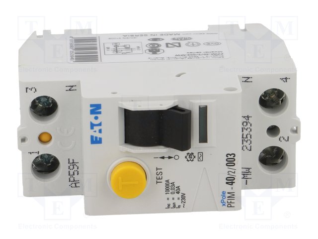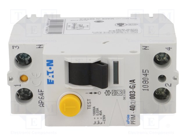 Аварийный выключатель; Iном: 40А; Iдифф: 30мА; Ударный ток: 250А |