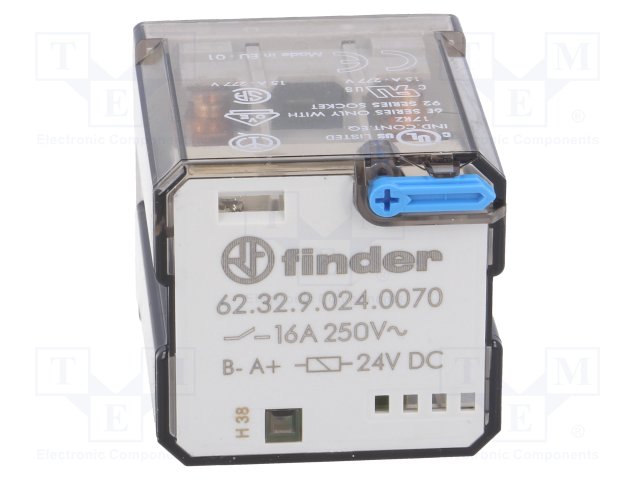 Реле: электромагнитное; DPDT; Uобмотки: 24ВDC; 16A/250ВAC; 445Ом |