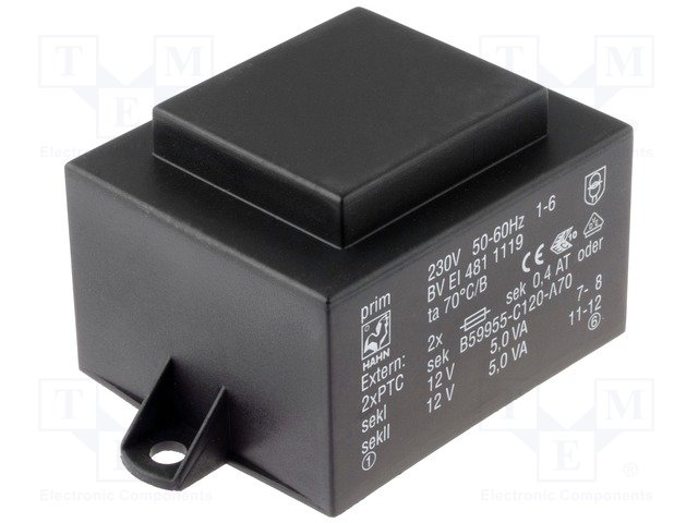 Трансформатор: залитый; 12ВА; 230ВAC; 6В; 2000мА; Монтаж: PCB; 350г