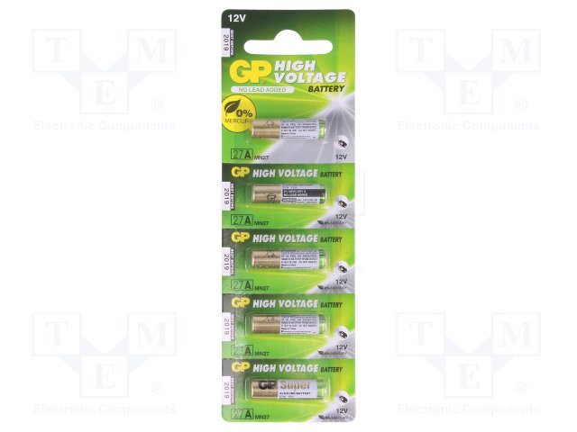 Батарея: щелочная; 12В; 27A,8LR50,A27,MN27; Кол-во бат: 5; Ø8x28мм