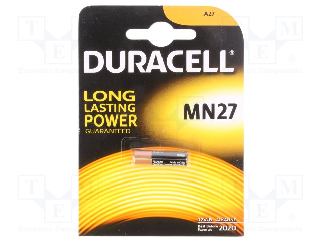 Батарея: щелочная; 12В; 27A,8LR50,MN27; Кол-во бат: 2; Ø8x28мм