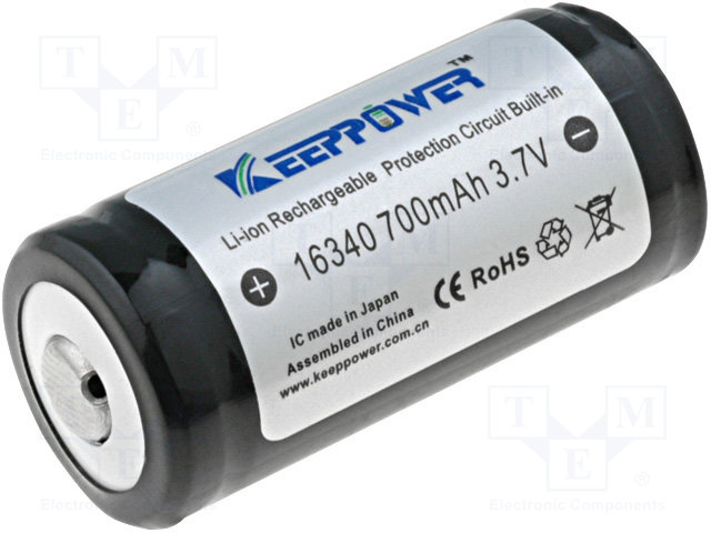 Аккум: Li-Ion; 16340; 3,7В; 650мАч; Ø16x36мм; 3А