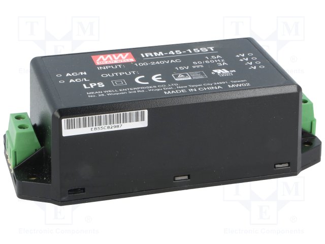 Блок питания: импульсный; модульный; 45Вт; 15ВDC; 109x52x33,5мм