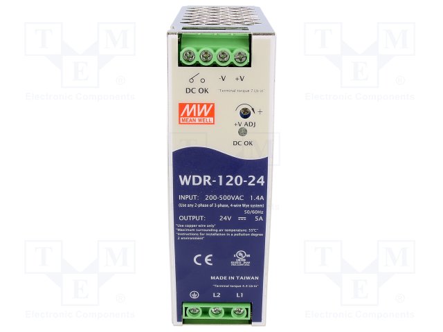 Блок питания: импульсный; на DIN-рейку; 120Вт; 24ВDC; 5А; IP20 |