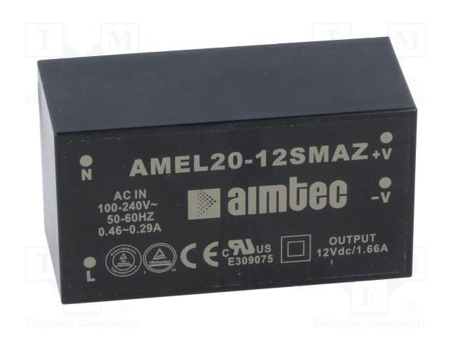 Преобразователь: AC/DC; 20Вт; Uвых: 12ВDC; Iвых: 1,66А; 81%; 4кВ; 70г