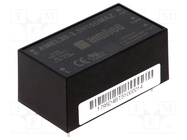 Преобразователь: AC/DC; 20Вт; Uвых: 15ВDC; Iвых: 1,33А; 81%; 4кВ; 70г