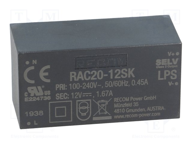 Преобразователь: AC/DC; 20Вт; Uвых: 12ВDC; Iвых: 1,67А; 86%; 3000В |
