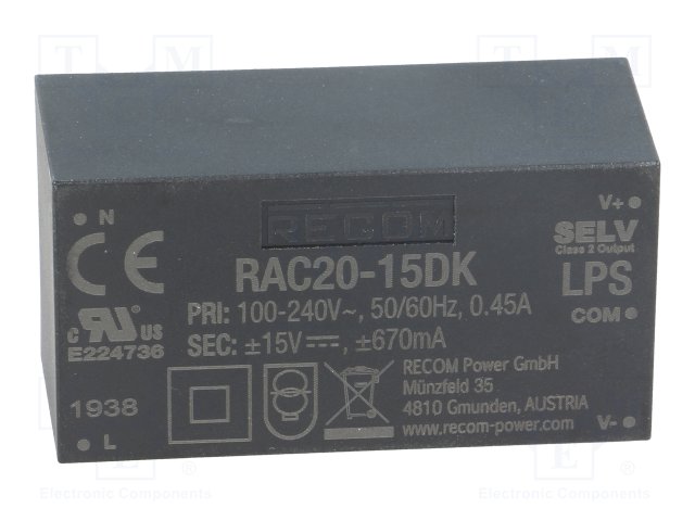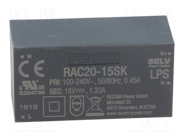Преобразователь: AC/DC; 20Вт; Uвых: 15ВDC; Iвых: 1,33А; 83%; 3000В |