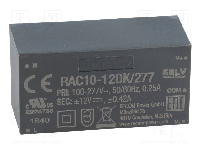 Преобразователь: AC/DC; 10Вт; Uвых: 12ВDC; Iвых: 840мА; 80%; 3750В |