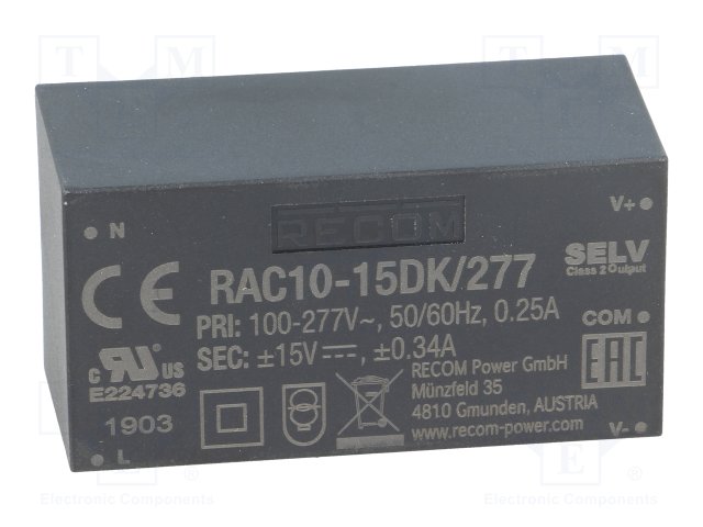 Преобразователь: AC/DC; 10Вт; Uвых: 15ВDC; Iвых: 340мА; 79%; 3750В |