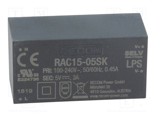 Преобразователь: AC/DC; 15Вт; Uвых: 5ВDC; Iвых: 3А; 84%; Монтаж: PCB |