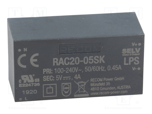 Преобразователь: AC/DC; 20Вт; Uвых: 5ВDC; Iвых: 4А; 84%; 85÷264ВAC |