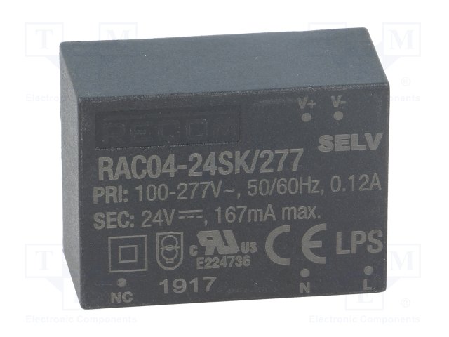 Преобразователь: AC/DC; 4Вт; Uвых: 24ВDC; Iвых: 170мА; 80%; 3000В |