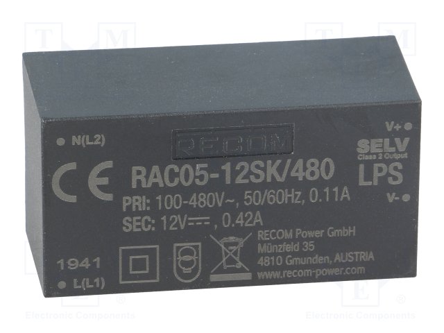 Преобразователь: AC/DC; 5Вт; Uвых: 12ВDC; Iвых: 420мА; 65%; 4000В |