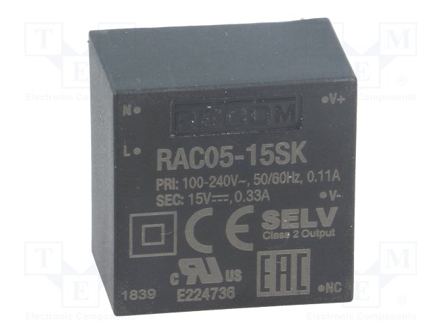 Преобразователь: AC/DC; 5Вт; Uвых: 15ВDC; Iвых: 330мА; 83%; 4200В |