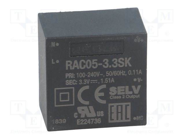 Преобразователь: AC/DC; 5Вт; Uвых: 3,3ВDC; Iвых: 1515мА; 76%; 3000В |