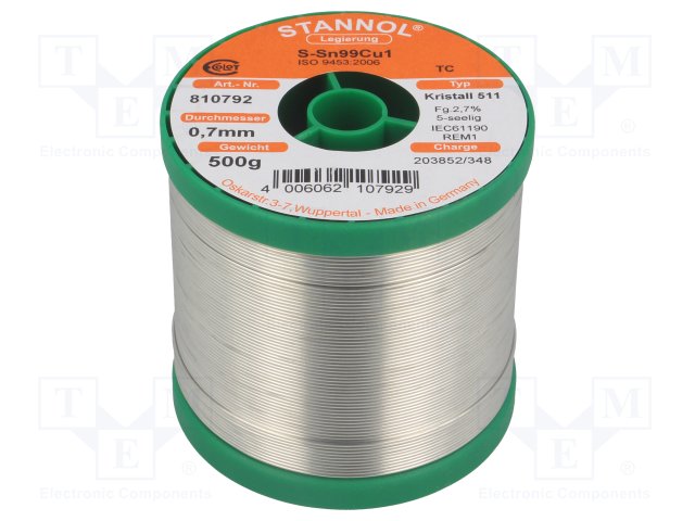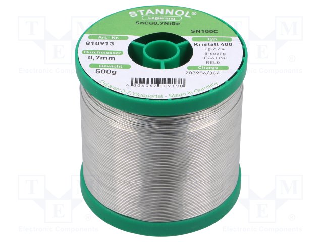 Проволочный припой; Sn99,3Cu0,7+NiGe; 0,7мм; 0,5кг; 227°C