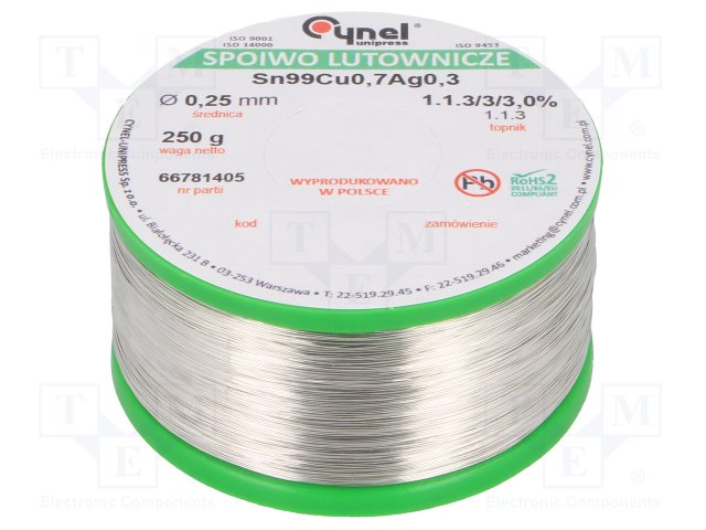 Проволочный припой; Sn99Ag0,3Cu0,7; 250мкм; 250г; 216÷227°C