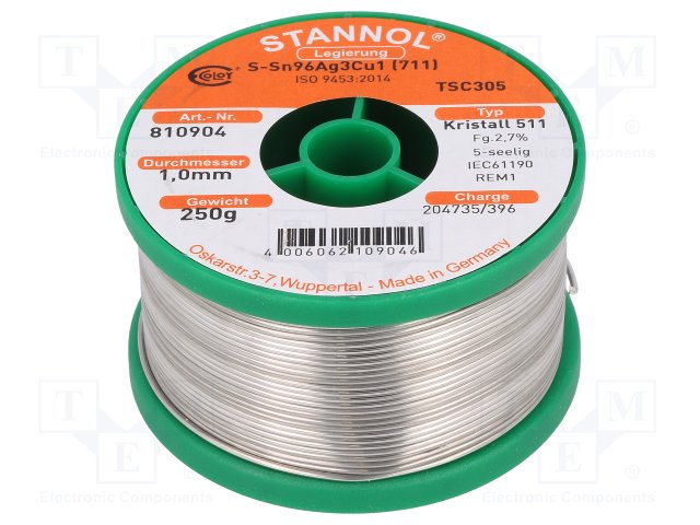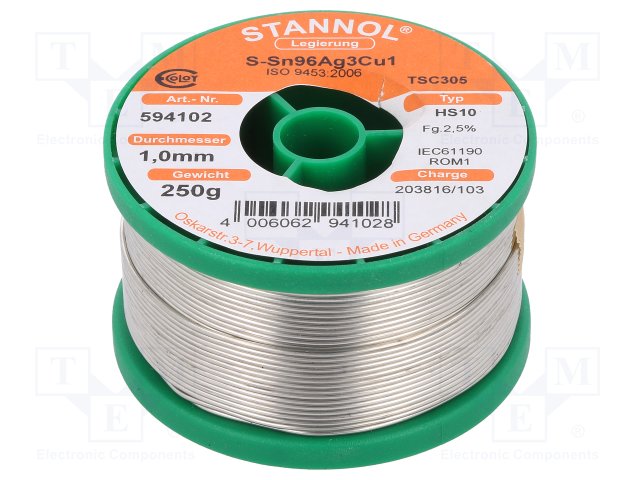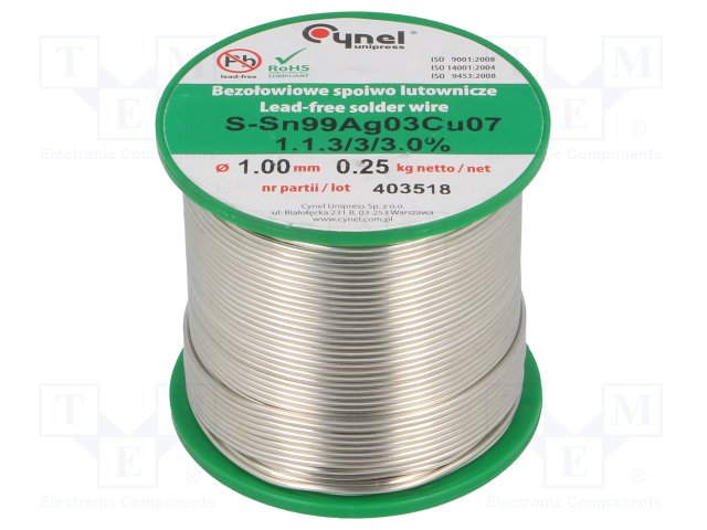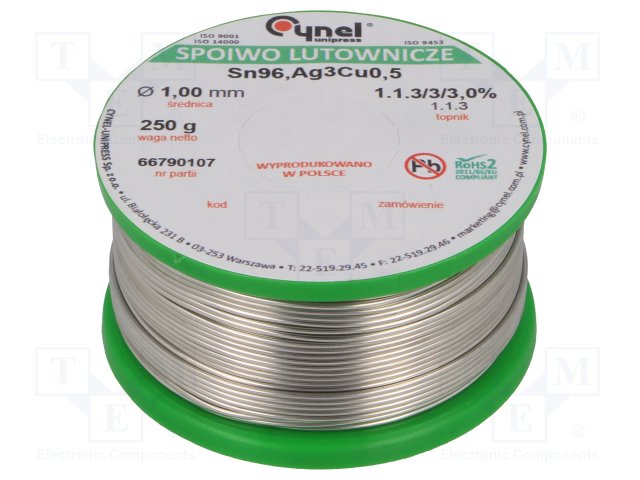 Проволочный припой; Sn96Ag3Cu1; 1мм; 0,25кг; не содержит свинца