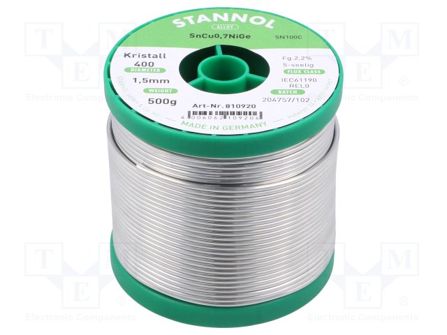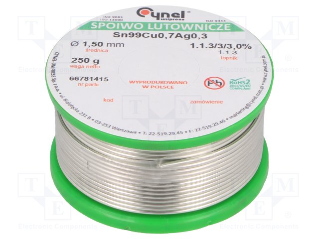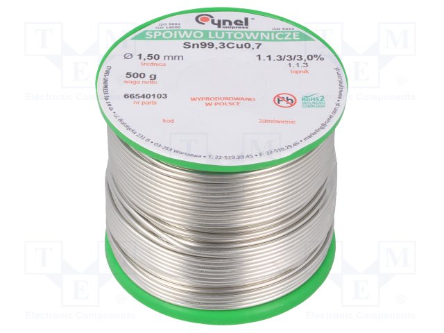 Проволочный припой; Sn99,3Cu0,7+NiGe; 1,5мм; 0,5кг; 227°C