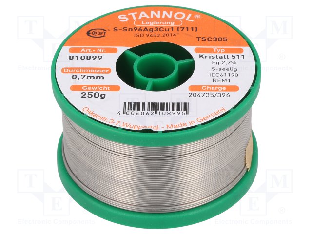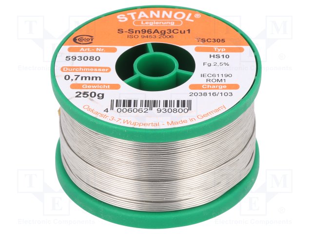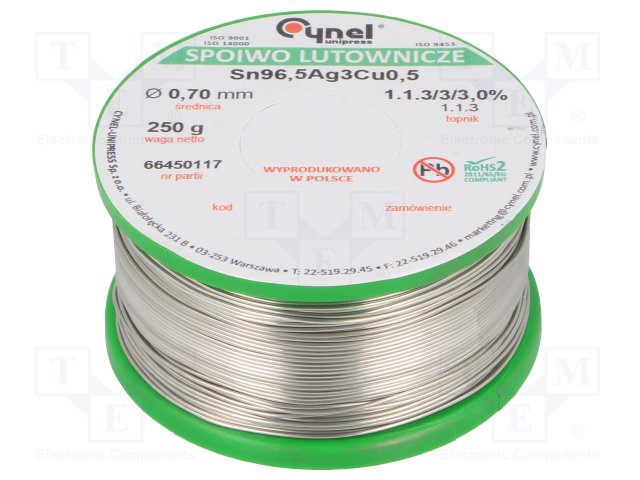 Проволочный припой; Sn96Ag3Cu1; 0,7мм; 0,25кг; Упаковка: катушка