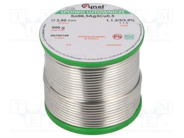 Проволочный припой; Sn96,5Ag3Cu0,5; 2мм; 500г; Упаковка: катушка