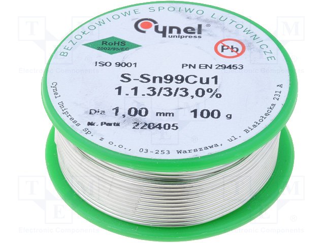 Проволочный припой; Sn99Cu1; 1мм; 100г; не содержит свинца; 2,2%